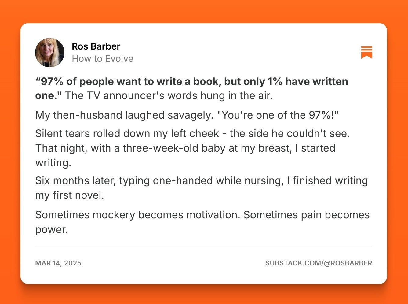 That 97% statistic, thrown at me in cruelty towards the end of my first marriage, was the start of my career as a novelist. After at least three false starts (the first when I was nineteen), it made me angry enough to start writing another novel, and this time, I finished it.
