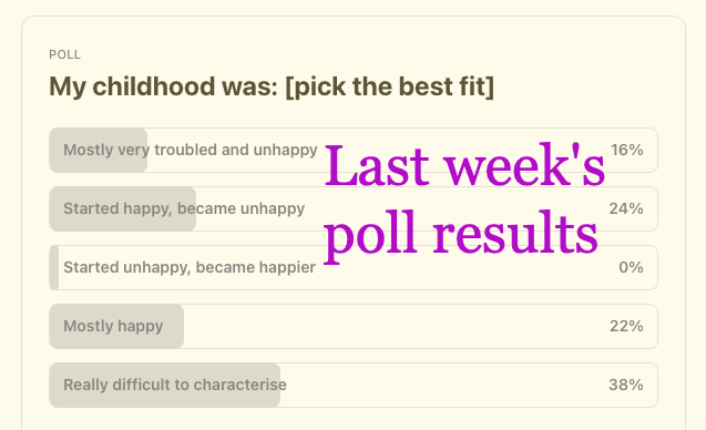 Last week’s poll asked you to characterise your childhood as happy or unhappy. At the time of taking this screenshot, my sample size was a mere 37 people, and the sample is too skewed to apply to the general population (you’re all subscribed to a Substack called How To Evolve, after all!). But wow, it’s very interesting that no one said their childhood started unhappy and became happier.