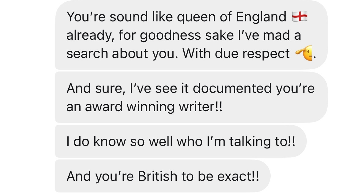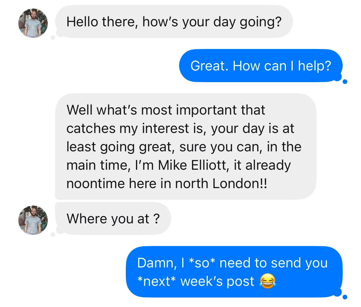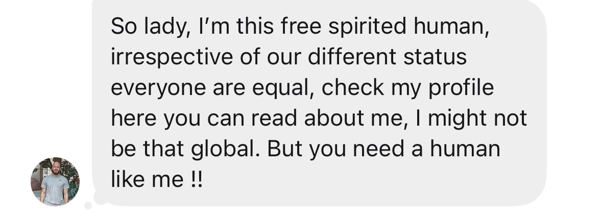 Gosh, I know right? Several times I laughed reading this, but I know it’s not funny, it’s frustrating, but your writing is fantastic and hilarious. Like my comment in the other thread, I really think Substack is now dealing with bots. Several DMs I’ve received recently don’t even make sense, much like the example you use here (or it’s a moron — either way, it’s bad news). As maddening as this is, I’m grateful you wrote about it because I feel better when another woman voices exactly what I’m thinking, too. I know we’re not alone!
