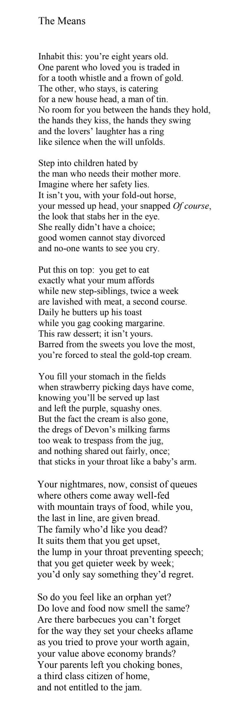 Except on Tuesdays and Saturdays. Those were the days our three stepsisters would visit. Though it was mostly still bread and butter and jam on Tuesdays, it would come with special jam and a special dessert, and on Saturdays, a proper cooked meal, because my stepfather would be present. But the pecking order still existed. In June, when we might be lucky enough to have strawberries and cream because my stepsisters were at the table, they would be served first. My three siblings and I would share out smaller portions of whatever was left: as I put it in my poem ‘The Means’, “the purple, squashy ones.” And with everyone else having been served lashings of single cream we’d be left, very often with the dregs… or no cream at all.