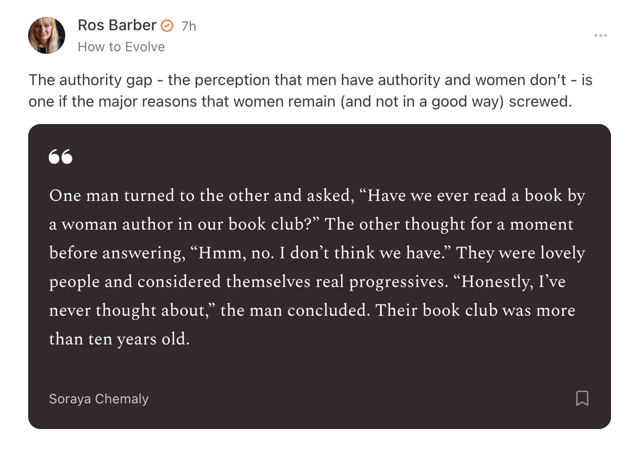 There is also A.R.Moxon, who garnishes his essay for men, ‘Fix Your Hearts or Die’, with the subtitle ‘It's an invitation, not a threat. The path to liberation for lonely men is feminism.’ It’s the same solution to relationship misery proposed by Celeste Davis: equality brings both men and women love, support, and feeling seen. His framing of patriarchy/feminism is as clear as it gets.