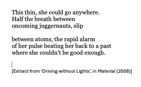 If you can’t afford a subscription but you love poetry, you can show appreciation by buying one of my books or leaving a review. The book most relevant to this post is Material, which contains all the poems documenting this part of my life, including the ‘Driving Without Lights’ sequence.