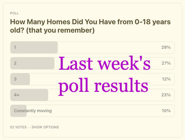 Last week’s poll asked you to tell me how many childhood homes you had. The snapshot (at 57 replies) surprised me: exactly a third of you (33%) said four or more. That “constantly moving” percentage definitely got me thinking. Me, I had two in the UK and two temporary ones in the US (my Dad’s sabbatical year at Berkeley), but I don’t think the number would matter so much if that second UK home hadn’t not felt like my home at all (it was very much my stepfather’s domain, and we four kids from the first marriage didn’t feel very welcome there).